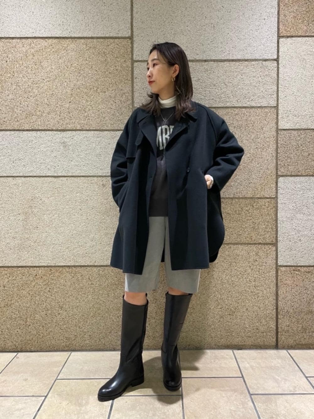 ・身長:162.5cm ・普段のサイズ:ボトムス M/シューズ 24cm 【サイズ感】 アウター:ゆったり インナー:標準的 トップス:ややゆったり ボトムス:ややゆったり シューズ:小さめ(38でジャスト) 【素材感】 アウター:なめらかな肌触りの柔らかな素材 インナー:つるっとした伸縮性のある素材 トップス:裏起毛の厚みのある素材 ボトムス:柔らかな素材 【コーディネートポイント】 今年トレンドのロングブーツをポイントに、カジュアルなコーディネートに致しました。 こちらのアウターは裏地が無いので軽い着心地で、1着で2パターンの着用方法がある為コーディネートによって変えて頂けます。 パンツスタイルはもちろん、スカートやワンピース等で羽織っていただいてもバランスのとりやすいアウターです。