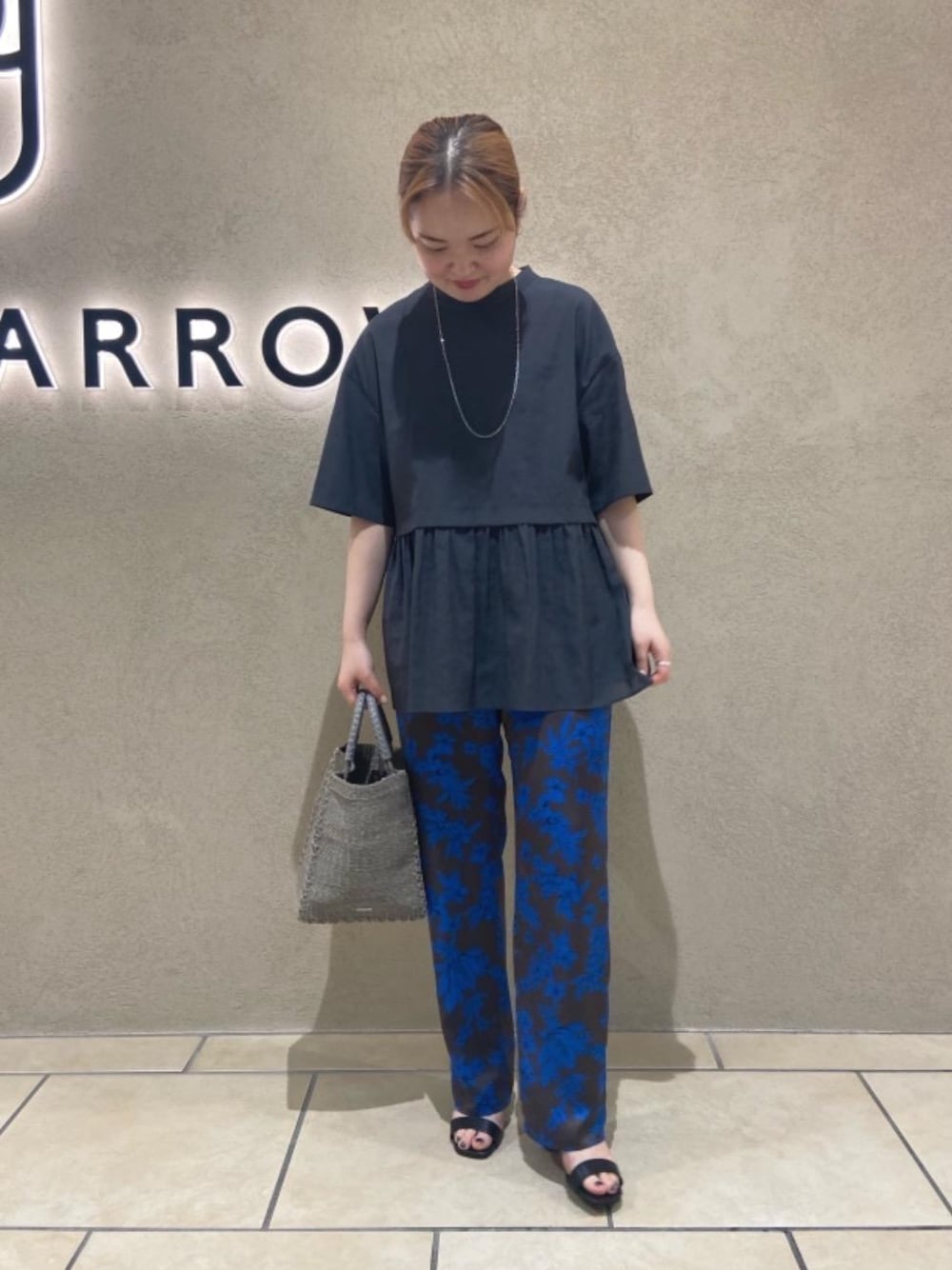 花柄のイージーパンツにデザインのあるトップスを合わせてカジュアルになりすぎないようにしました。 全体のトーンを合わせることで柄物のアイテムも上品にまとめられます。