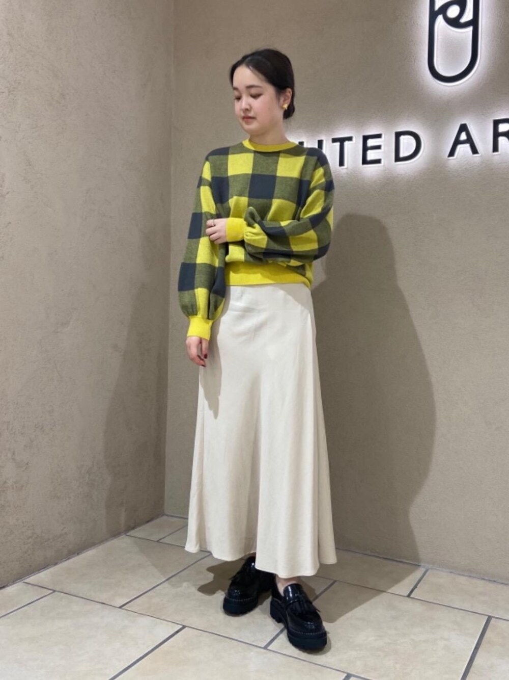 ●身長:153cm ●普段のサイズ トップス:36 ボトムス:34.36 シューズ:22.5cm 【サイズ感】 トップス:標準的 スカート:標準的 シューズ:標準的 【素材感、着心地】 トップス:袖にボリュームがあります。 スカート:身体のラインを拾いすぎないフレアシルエットです。 【コーディネートポイント】 着丈が短めのチェック柄のニットに、フレアスカートを合わせて全体のバランスを取りました。 スカートはシーズンレスで着用していただける素材なので、シャツやカットソー合わせはもちろんニット合わせもおすすめです。