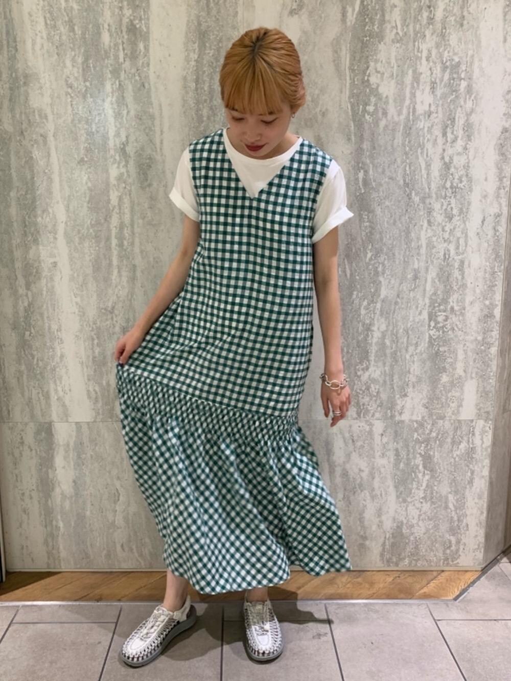 ギンガムチェックのワンピースにはTシャツとカジュアルなシューズを合わせ、可愛らしくなり過ぎないようにスタイリングしました。