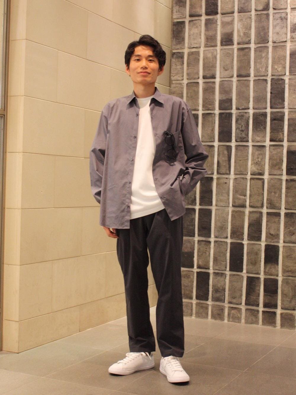 グレーを使ったワントーンコーディネートです。 アクセントとしてさりげないパイソン柄が特徴のスニーカーを合わせています。