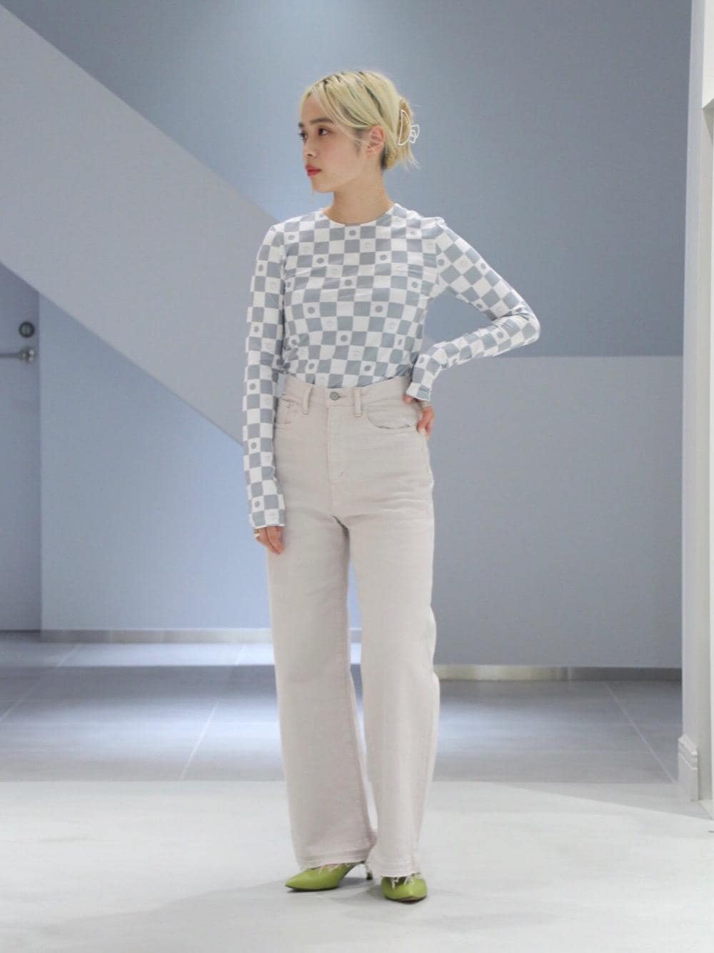 年齢 20代前半 身長 156cm 普段サイズ トップス36/ボトムス36/シューズ24.0cm 【サイズ感】 トップス:タイトフィット ボトムス:腰まわりは標準的。ハイウエストで裾に向かって広がる バギーシルエット 【素材感】 トップス:ポリエステルベースのスポーティな素材感 ボトムス:ミドルオンスのソフトなデニム 【コーディネートポイント】 フィット感のあるスポーティな素材が特徴の<The Open Product (ザ オープン プロダクト)>のトップスと、オーガニックな雰囲気のバギーデニム、上下の異素材感がポイントです。モノグラムの主張の強いトップスをあえて主役に、全体のトーンを淡い色味でまとめたので、足元には発色の良いワンテクヒールをアクセントに、大人の女性らしさをプラスしました。