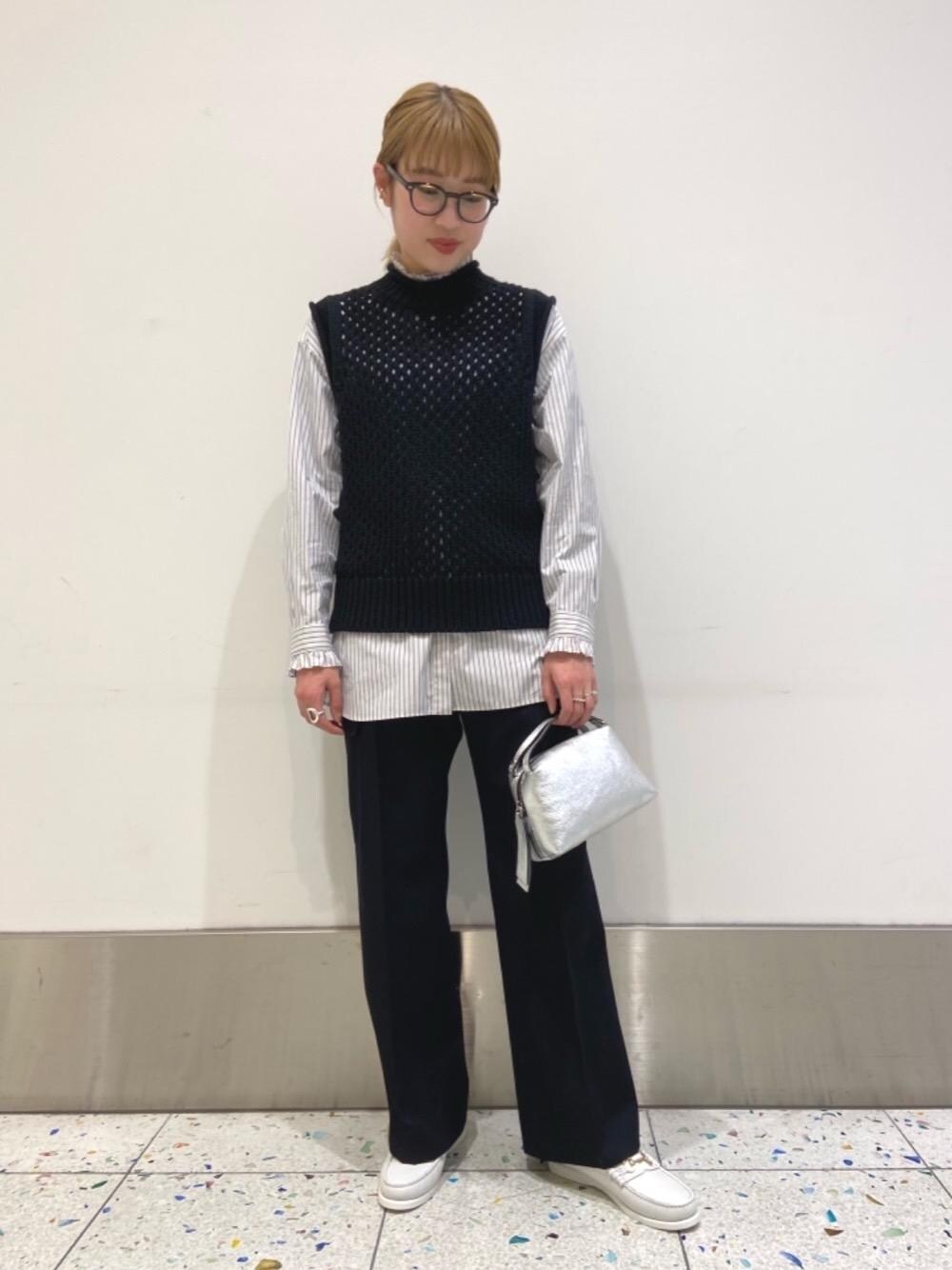 【身長】162㎝ 【普段のサイズ】トップス/38 ボトムス/36・38 シューズ/24㎝・24.5㎝ 【サイズ感】 ベスト:標準的 シャツ:ややゆったり パンツ:丈長めで履きたかったので、38を着用。ウエストはゆとりあり。 シューズ:37h着用で、つま先ややゆとりあり。サイドはジャスト。 【素材感・着心地】 ベスト:麻混のサラッとした素材感。 ブラウス:柔らかい肌触りのコットン素材。 パンツ:程よい厚みがあり、ややハリのある素材感。 【コーディネートのポイント】 〈BATONER(バトナー)〉の透かし柄に編まれたニットベストに、ストライプのフリルブラウスを合わせ、ほんのり甘さをプラスしました。 センタープレスの入ったカーゴパンツは、シャツやブラウスに合わせることで、きれい目なスタイルをモードな印象に仕上げてくれます。