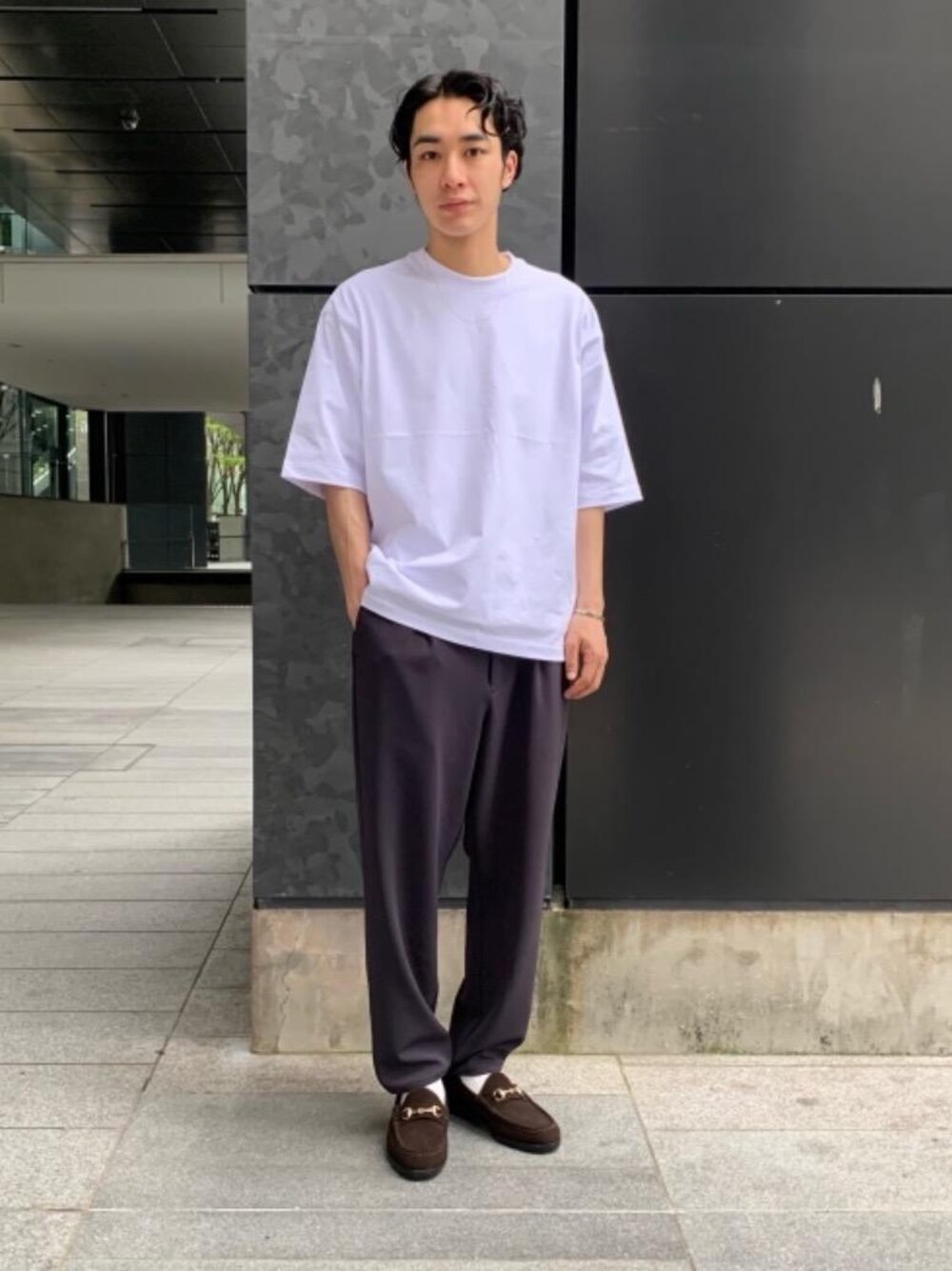 身長:174cm 体重:64kg 普段サイズ: トップス/L,XLサイズ パンツ/M.Lサイズ シューズ/26.5cm 【サイズ感】 ・トップス:ゆったり ・パンツ:ややゆったり ・シューズ:標準 【素材感、着心地】 ・トップス:艶感のある素材感で、サイジングも大きいので1枚で様になるTシャツです。 ・パンツ:肌に触れる裏地は柔らかく、表地は街着としても格好のつく、サラッとした質感をしております。 【コーディネートポイント】 各アイテムのサイジングや、素材感に特徴のあるものを着用し、シンプルながらもお洒落なTシャツスタイルに仕上げました。足元はスエードのローファーを履くことでバランスをとりました。