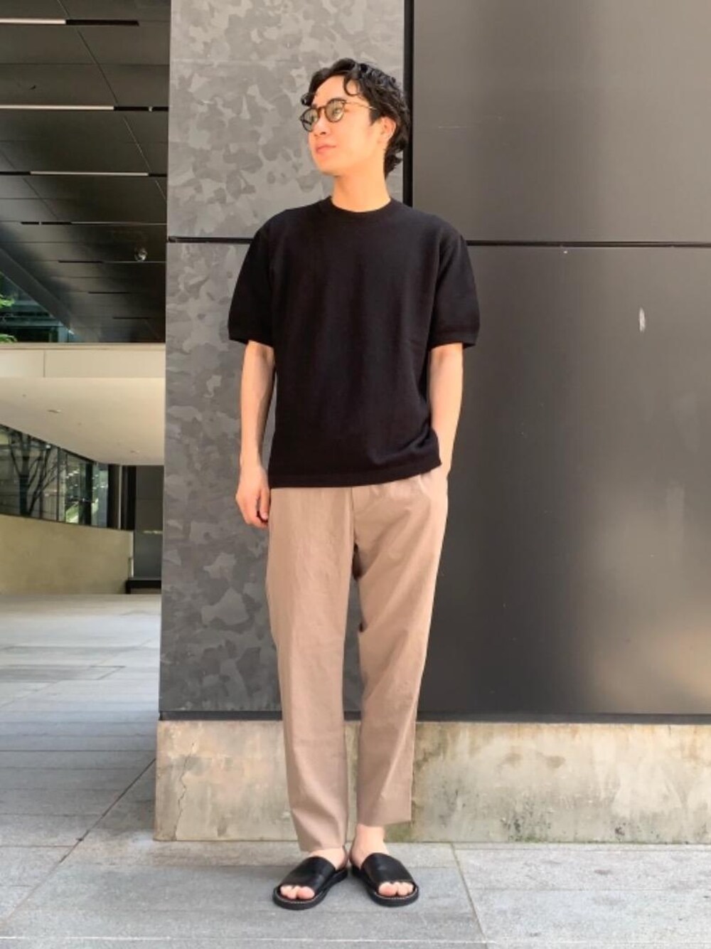 身長:174cm 体重:64kg 普段サイズ: トップス/L,XLサイズ パンツ/M.Lサイズ シューズ/26.5cm 【サイズ感】 ・トップス:ややゆったり ・パンツ:ややゆったり ・シューズ:標準 【素材感、着心地】 ・トップス:柔からな生地感で、斜めになった編み目が特徴的な半袖のニットです。 ・パンツ:かなり軽く、シャリ感のある生地なので、これからの季節にも快適にお召し頂けます。 【コーディネートポイント】 各アイテムの素材感を変え、シンプルながらも深みのあるスタイリングに仕上げました。サングラスでパンツの色味をさりげなく拾い、統一感を出したことがポイントです。