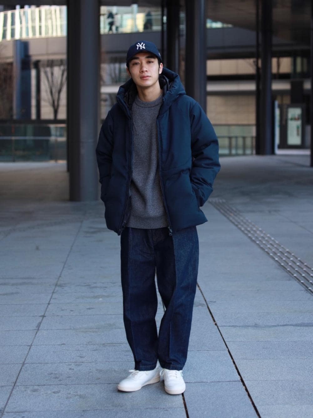 身長:175cm 体重:58kg 普段サイズ:ゆったりとしたサイズ感が好み トップス/L,XLサイズ パンツ/M.Lサイズ シューズ/26.5cm 【サイズ感】 ・ダウン:ややゆったり ・ニット:ややゆったり ・パンツ:ややゆったり ・シューズ:標準 【素材感、着心地】 ・アウター:綺麗な印象のあるツイル地です。 ・ニット:網目の大きな、軽さのあるニットです。 ・パンツ:腰回りにゆとりがあり、ゆったりとしながらも上品な印象のあるデニムです。 【コーディネートポイント】 綺麗に見えるように、品のある色味でまとめながらも、スポーティなアイテムを着用することで程よい遊び心を加えました。