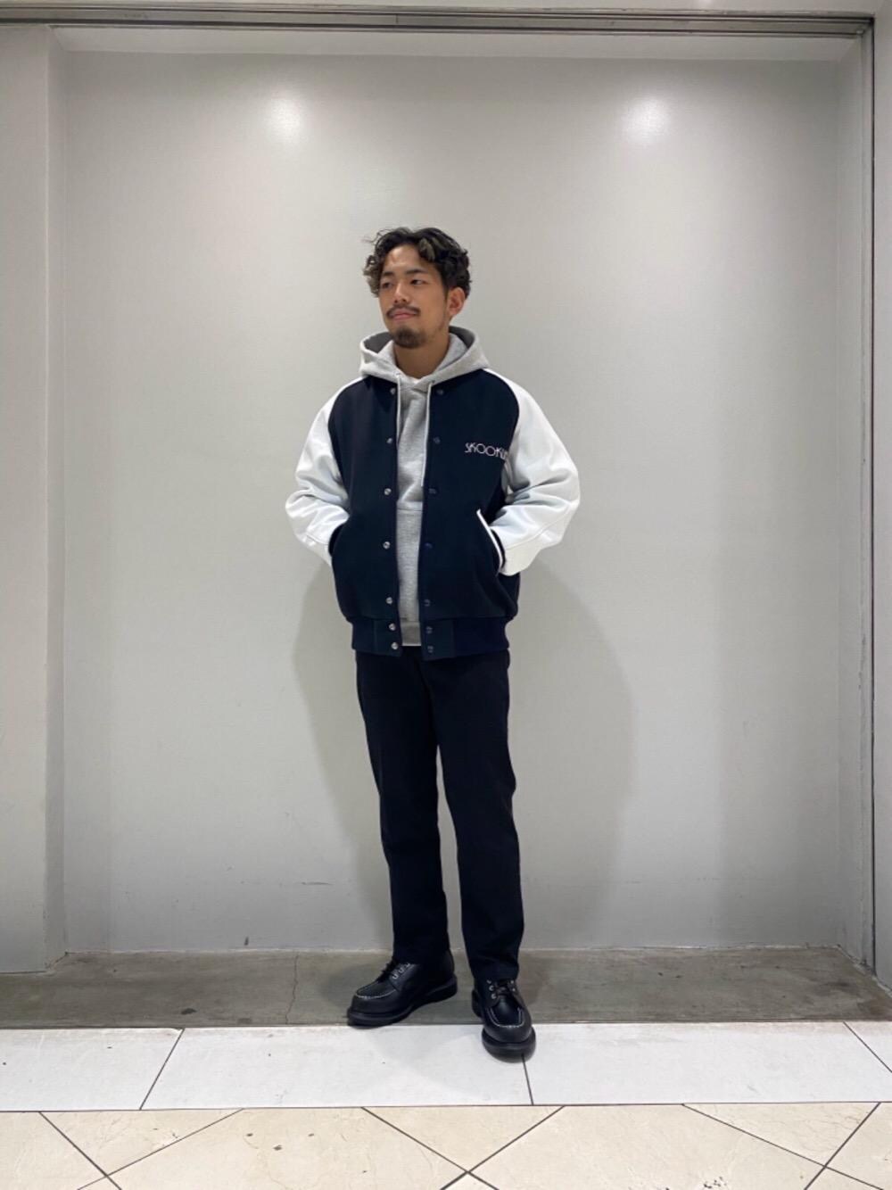 別注のスクーカムのスタジャンを軸とした、アメカジコーディネート。トップスはワンサイズアップし、トレンド感を意識しました。全体をダークトーンで纏めて、落ち着いた印象に仕上げました。
