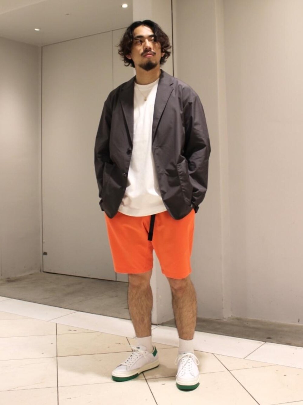 ビビットなカラーの<GRAMICCI>別注のショーツに、落ち着いたカラーのジャケットを合わせて全体的にバランス感のよい、夏でも着やすいコーディネートを意識しました。着心地も軽いジャケットですので、暑くなった際の着脱も楽にしていただけて、非常に便利です。