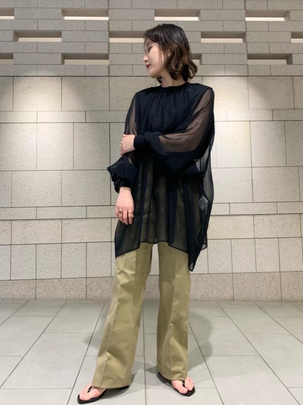 HYKEのトップスとボトムスを使いコーディネートを組みました。トップスのインナーにはTシャツのような袖があるものをお召しいただくのもオススメです。