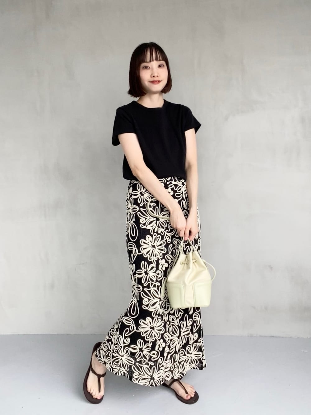 【サイズ感】 •Tシャツ すっきりめのデザインなので、きれいにスカートにタックインできます◎ •スカート FREEサイズでも大きく感じることはなかったので、細身の方もご着用いただけます。 •サンダル サンプルのため、普段サイズより大きめのサイズを履いています。 【コーディネートポイント】 Tシャツとスカートの色をブラックで統一してみました!バッグの質感でカジュアルさを抑えることができるので、大人フェミニンとして着れます◎