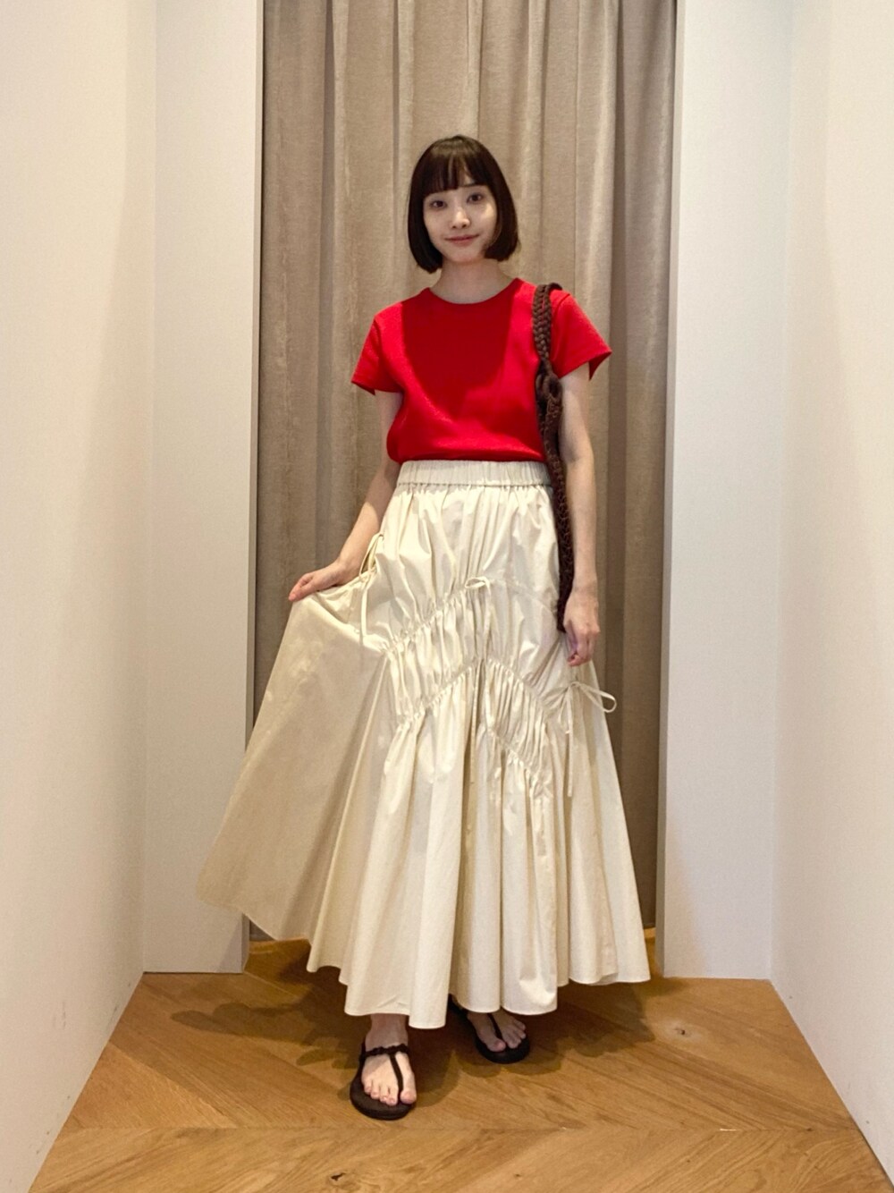 【サイズ感】 •Tシャツ 標準的。袖部分がすっきりめのデザインなので、上品にご着用いただけます。 •スカート 標準的。Sサイズでちょうどよかったです。 •サンダル サンプルのため、普段サイズより大きめのサイズを履いています。 【コーディネートポイント】 海沿いを散策したりカフェでお茶したりとする休日にぴったり。メッシュ素材のバッグを合わせると一気にカジュアルさがでます◎ 【Instagram】 @sasahara_ua スタイリングやプライベート等を投稿しておりますので、ぜひお気軽にフォローをお願いいたします。お待ちいたしております♡
