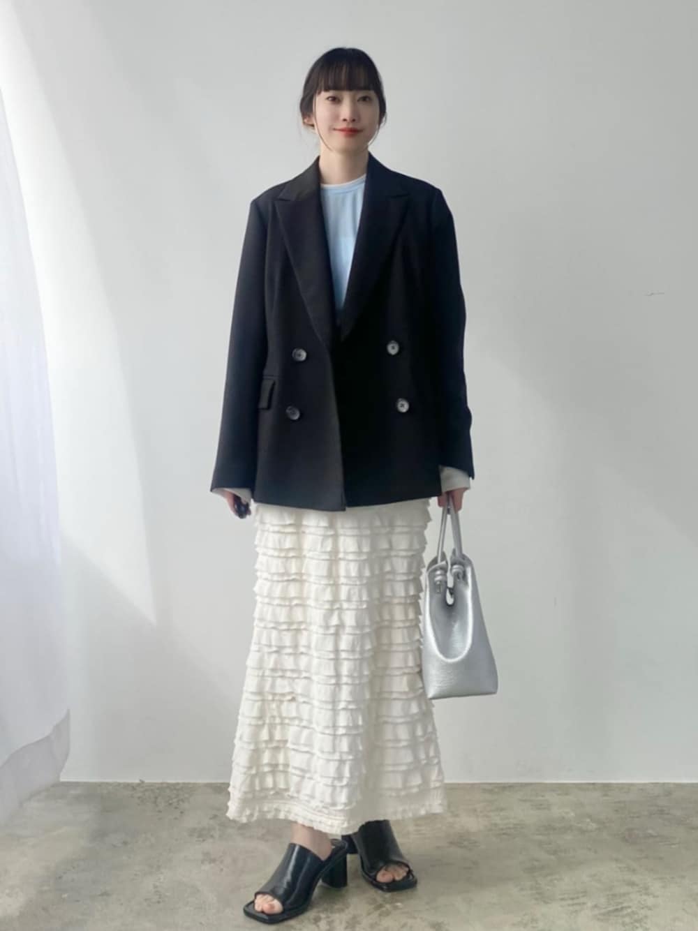 ●サイズ感 ジャケット ややゆったり。カッチリしすぎない素材なので、休日のお出かけからフォーマルシーンまで幅広く着回ししやすい❤︎ カットソー 小柄さんにとってはややゆったり。レイヤード風なのでジャケットから袖がはみ出てもかわいいです。 スカート 標準的。 サンダル サンプルのため、普段サイズより大きめのサイズを履いています。 ●コーディネートポイント きれいめのジャケットとフリルスカートを合わせることで大人フェミニンがすぐ叶うコーデ。辛口さんは、シルバー系のバッグでフェミニン要素を抑えてみて。