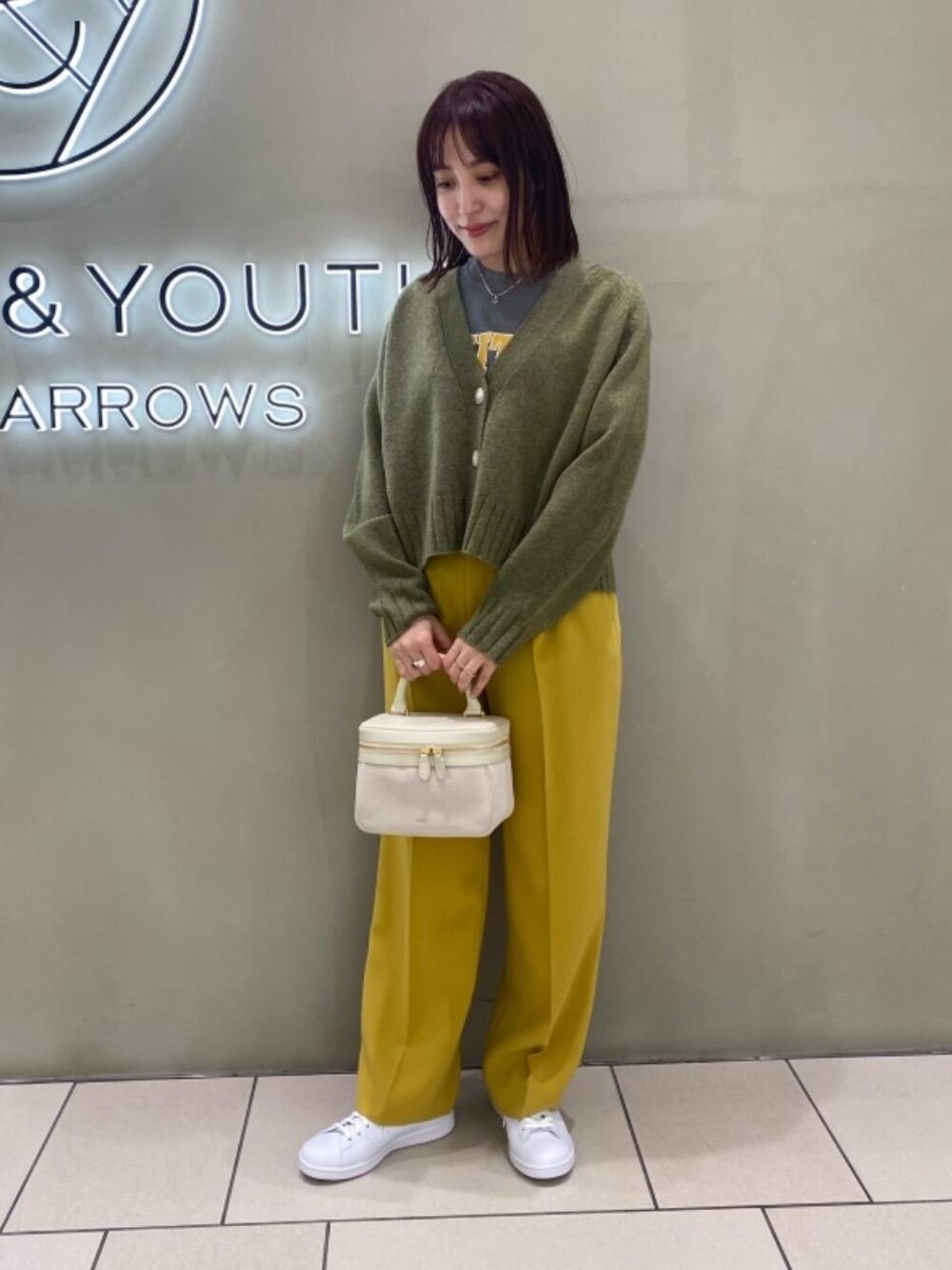 身長157㎝ 【カーディガン】標準 【カットソー】ゆったり 【パンツ】標準 今年らしいショート丈のカーディガンにイエローのカラーパンツを合わせました。 パンツをメインに統一感のある色味で、足元をスニーカーにしカジュアルにまとめました。カーディガンはボタンを開けたスタイリングも可愛く、5枚目に載せております。 バックはCh!iii×BY別注で、マチが広いため容量もしっかり入ります。取り入れるだけでトレンド感を演出してくれます。