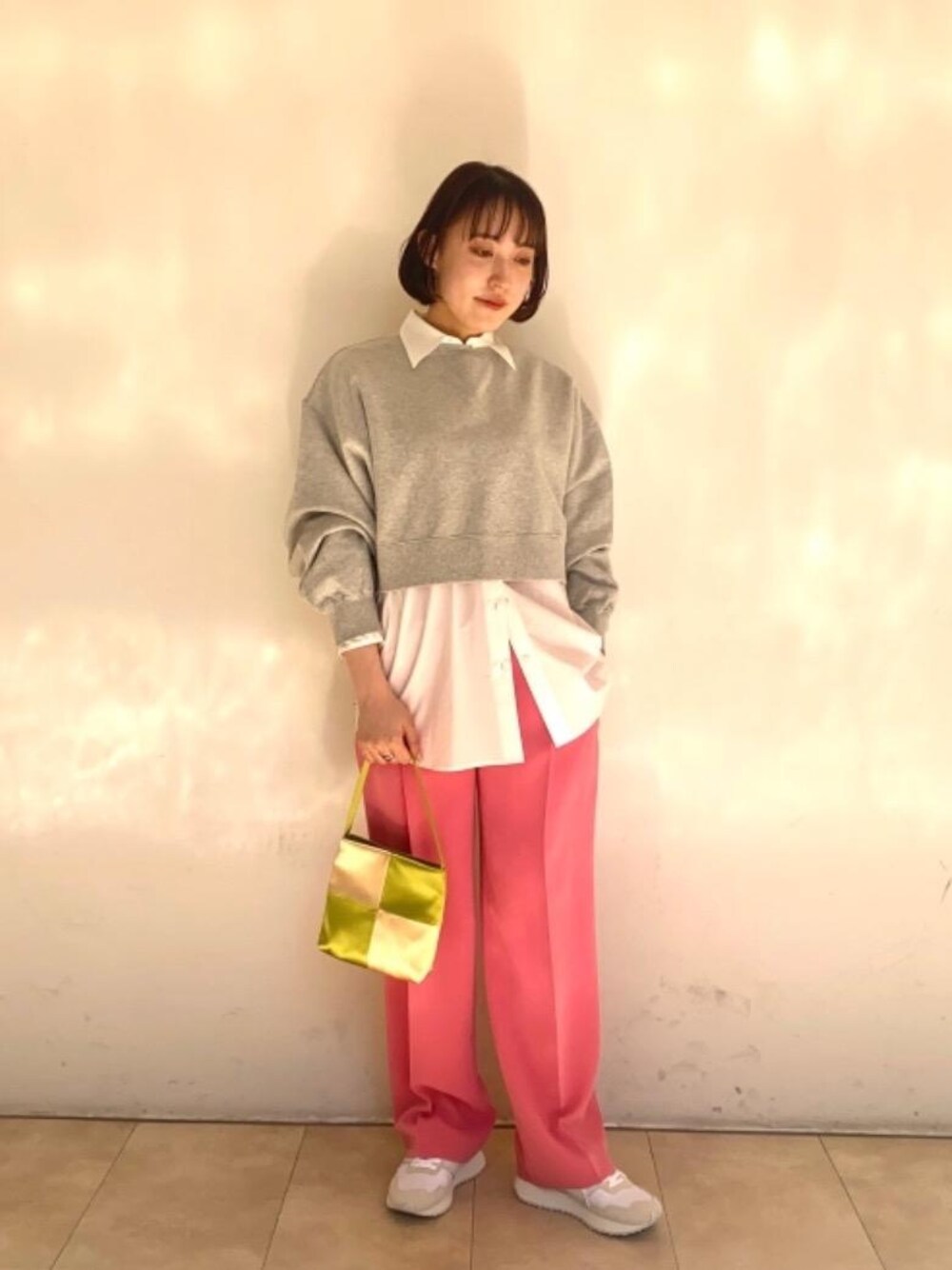 身長:157㎝ 普段サイズ:トップスS/ボトムスS/シューズ24㎝ 【サイズ感】 シャツ:標準 スウェット:やや小さめ パンツ:標準 【素材感・着心地】 シャツ:張り感のある素材 スウェット:柔らかく肌触りが良い ショート丈のスウェットにシャツをレイヤードしました。ショート丈の為、低身長の方でもバランス良くまとまります。トレンドのピンクのパンツは発色が良く、春らしくお召し頂けます。落ち感も綺麗でおすすめです。