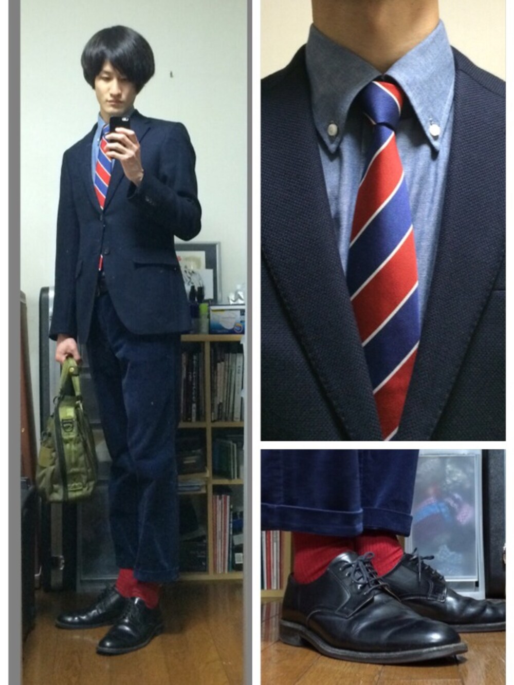 今日はデニムシャツでデニムのタグに乗っかり。 紺と赤のツートーンコーデ。 ♪今日のBGM♪ アルケミスト / ACIDMAN