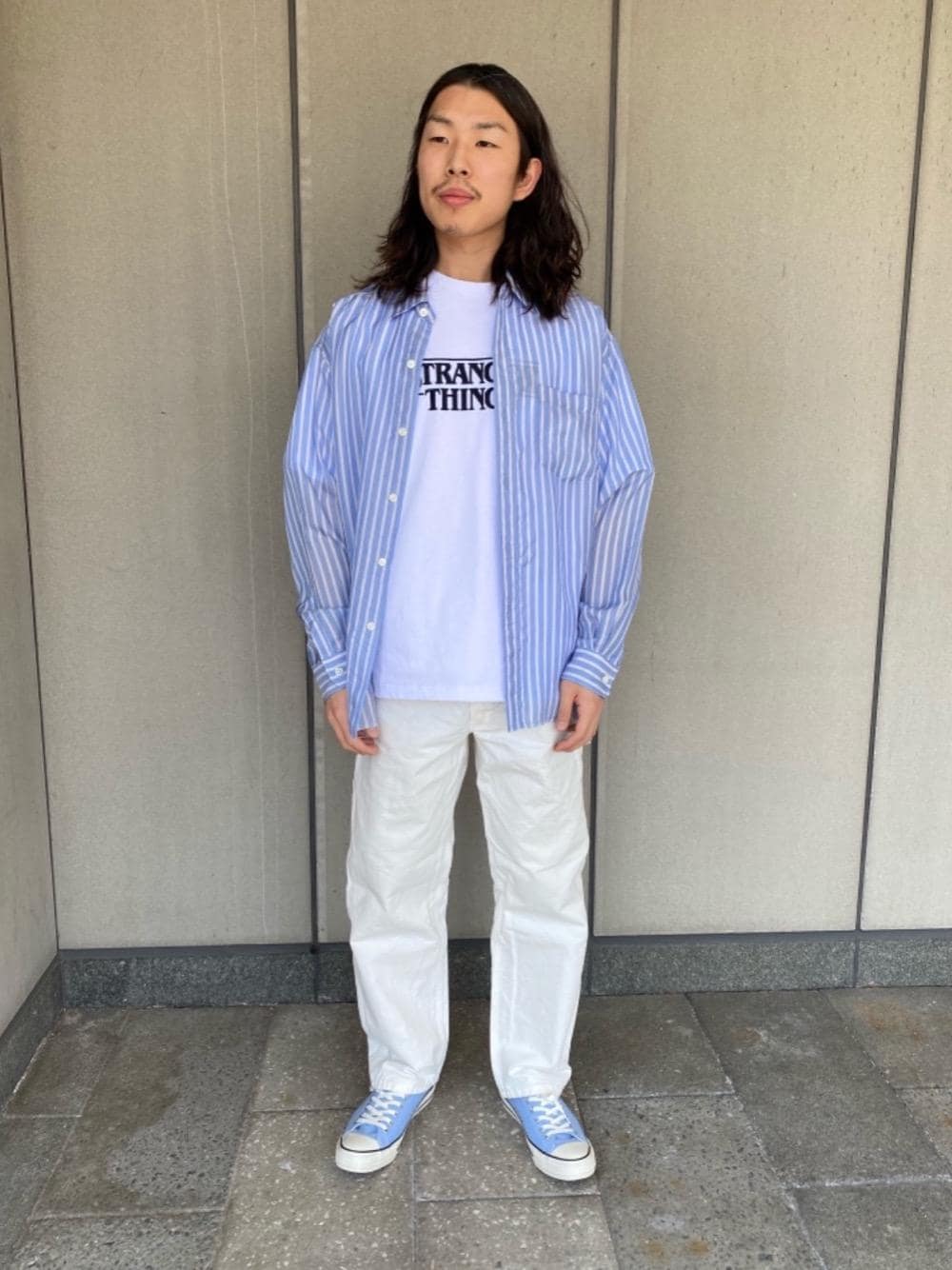 別注の<STRANGER THINGS>のTシャツをメインに、これからの時期らしい爽やかな色合いでコーディネートしました。 フロントにはロゴステッチ、後ろ身頃にはフォトプリントと、Tシャツ単体でも羽織のインナーとしてもお使い頂ける物になっております。