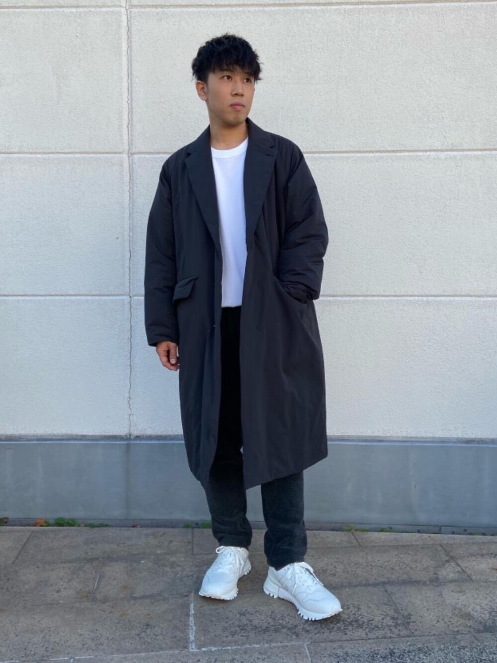 フリースのパンツを使った都会的なコーディネートです。 このパンツはウエストがゴムになっており普段使いはもちろん、テレワークなどのご自宅用の部屋着としても使っていただけます。