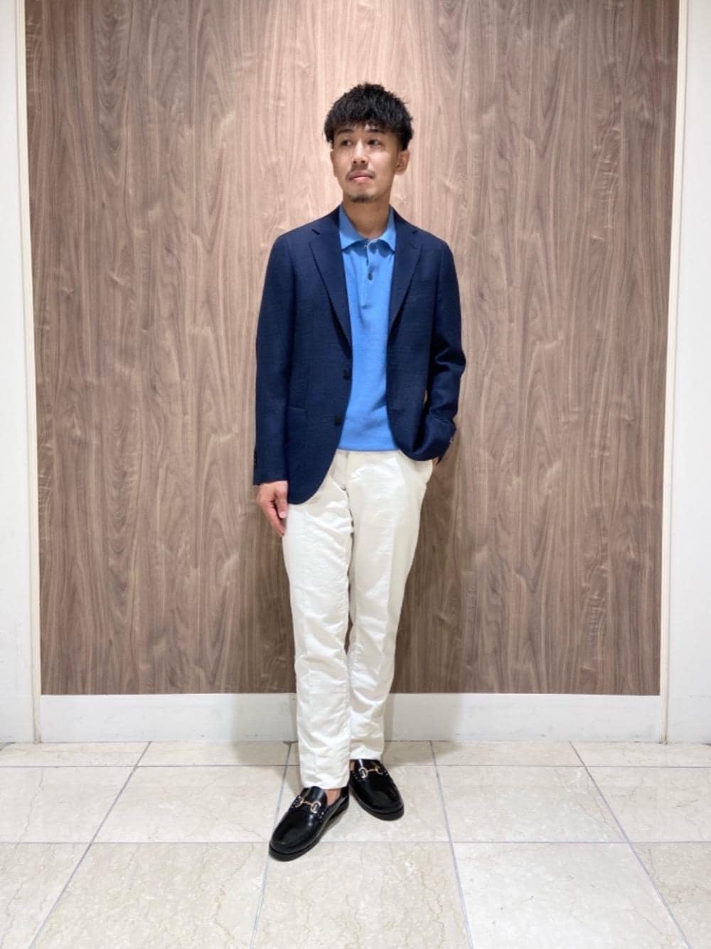 【身長】 170cm 【普段サイズ】 ジャケット:M、44 パンツ:M、44、31inch ニット:M シューズ:27.5cm、8 【サイズ感】 ジャケット:通常のサイズ感 パンツ:細身 ニット:ややゆったり シューズ:やや大きめ 【素材感】 ジャケット:ザラザラとした素材感 パンツ:柔らかく、伸縮性がある ニット:目が粗く、ザラザラとした素材感 【コーディネートポイント】 全体の色味を統一すると、上品な印象になります。 パンツは白でくるぶしを出して穿き、ローファーを合わせて夏の軽快さを強調しました。