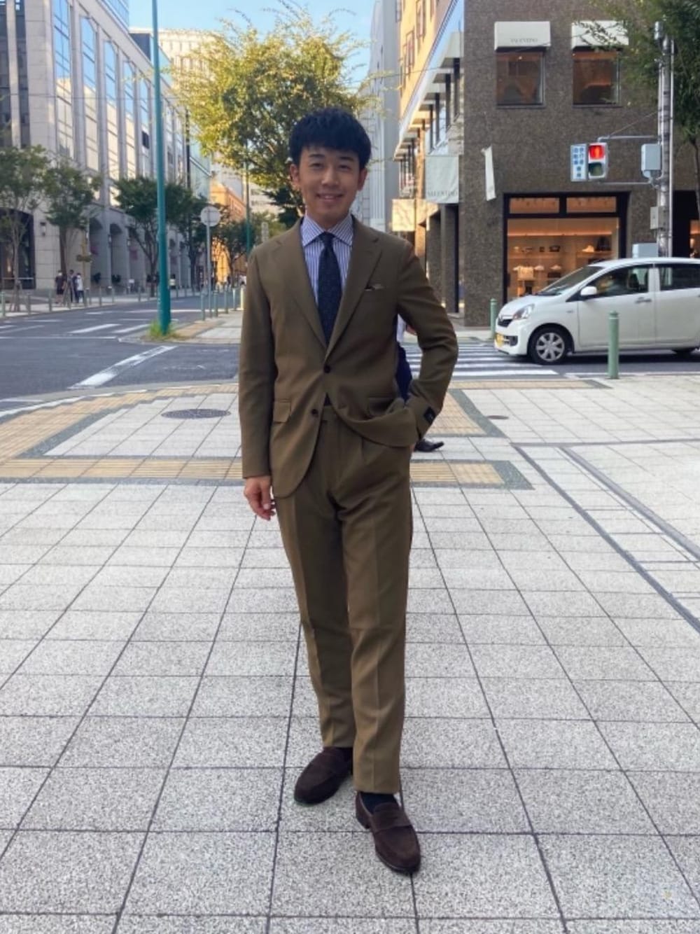 【身長】 170cn 【普段サイズ】 ジャケット:44 パンツ:44 シャツ:37 シューズ:27.5cm、8、42 【サイズ感】 ジャケット:通常のサイズ感で、伸縮性がある パンツ:通常のサイズ感で、伸縮性がある シャツ:通常のサイズ感 シューズ:通常のサイズ感 【素材感】 ジャケット:微起毛で、ざらざらとした肌触り。秋冬におすすめ。 パンツ:微起毛で、ざらざらとした肌触り。秋冬におすすめ。 【コーディネートポイント】 こちらのような鮮やかな色で、硬くなりすぎないスーツには、プリントタイがおすすめです。 またシャツとネクタイにはグレーを合わせて、シックな印象を与えるようにしました。