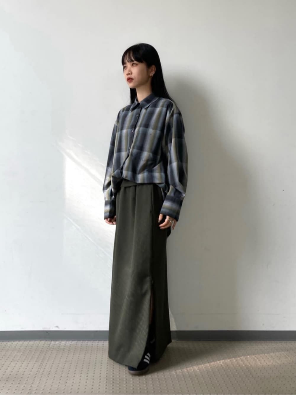 【サイズ】 シャツはSサイズです。 スカートはSサイズです。 【コーディネートポイント】 チェックシャツにIラインスカートを合わせました。ウエスト部分を折って短く着用することが可能で、ベルトもつけられる仕様がこだわりです。スリットはファスナーで長さを調整できます。