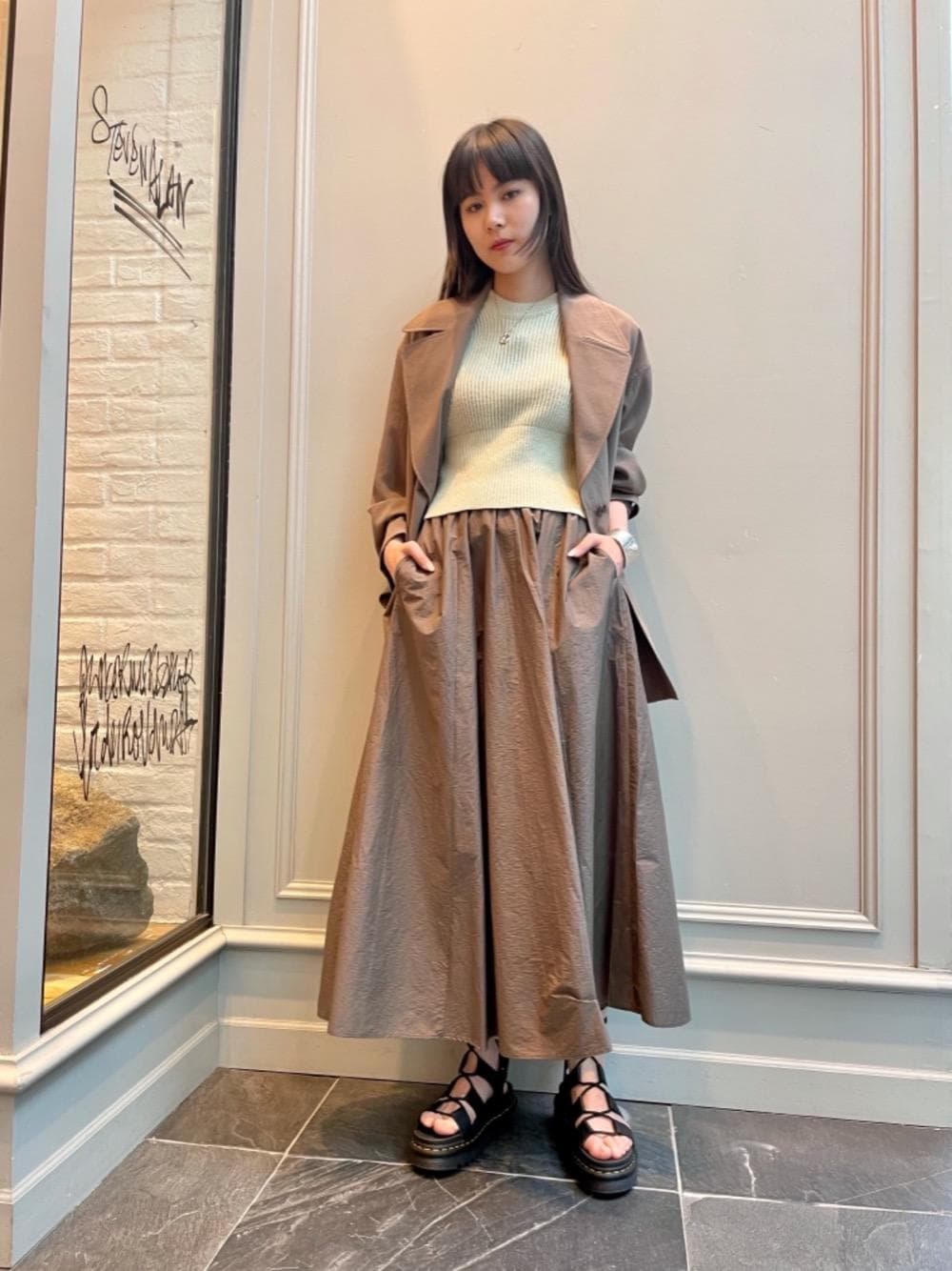 ■身長166センチ ■着用サイズ アウター/スカート:Mサイズ 今年らしいすっきりとした大きめのラペルコートジャケットと同じ色味のスカートを合わせ、セットアップに見立てたスタイリングです。 差し色に〈AURALEE〉のトップスを合わせ、さらに春夏らしさをプラス。こちらのトップスは一枚での着用はもちろん、シャツやカットソーのレイヤードスタイルもおすすめです。