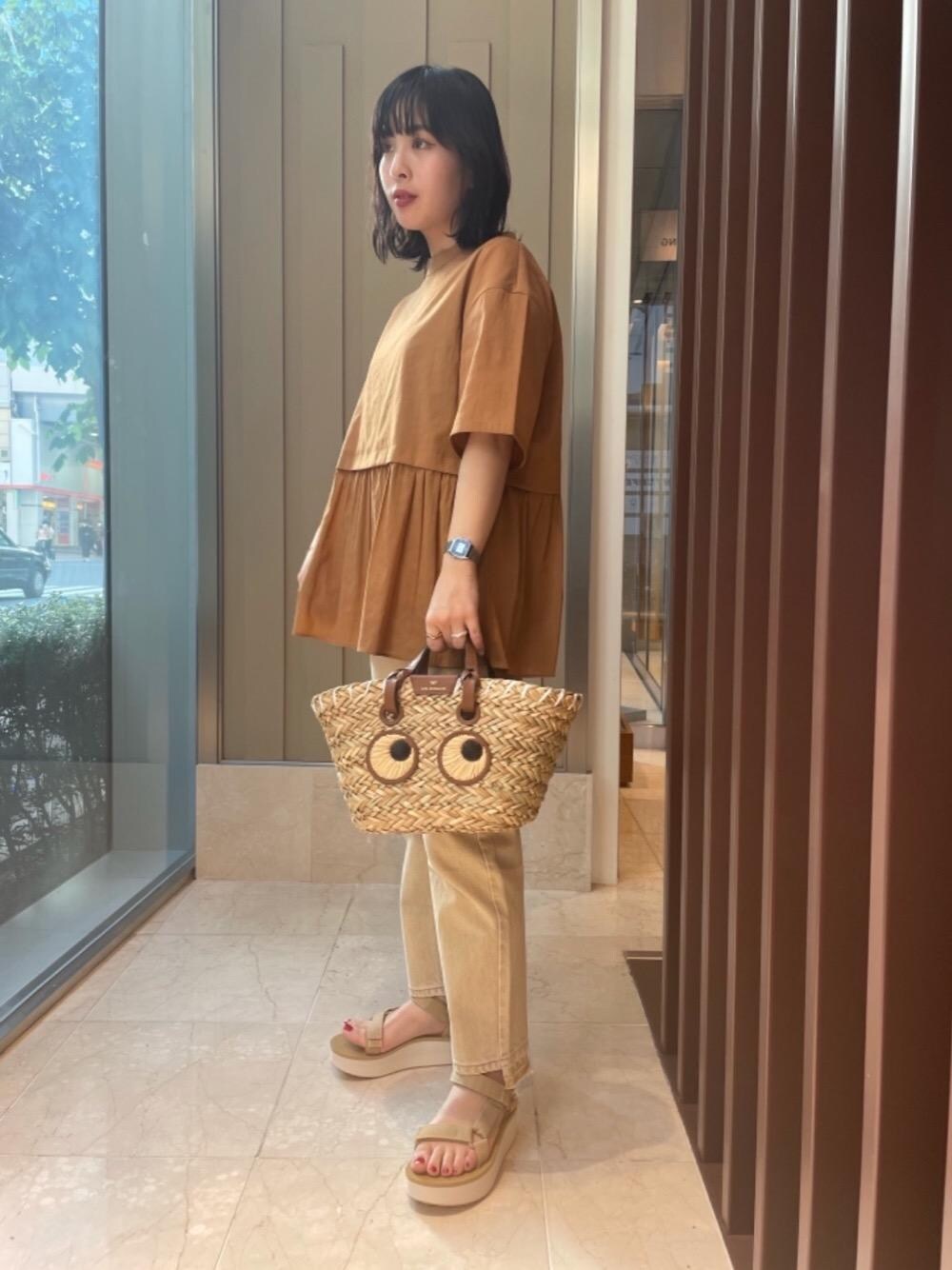 全身をベージュ系でまとめてみました。 トップスのサイズはフリーですが、ギャザーの切り替え部分の位置が高いので、157センチの私でもバランス良く着こなせるのでオススメです。