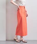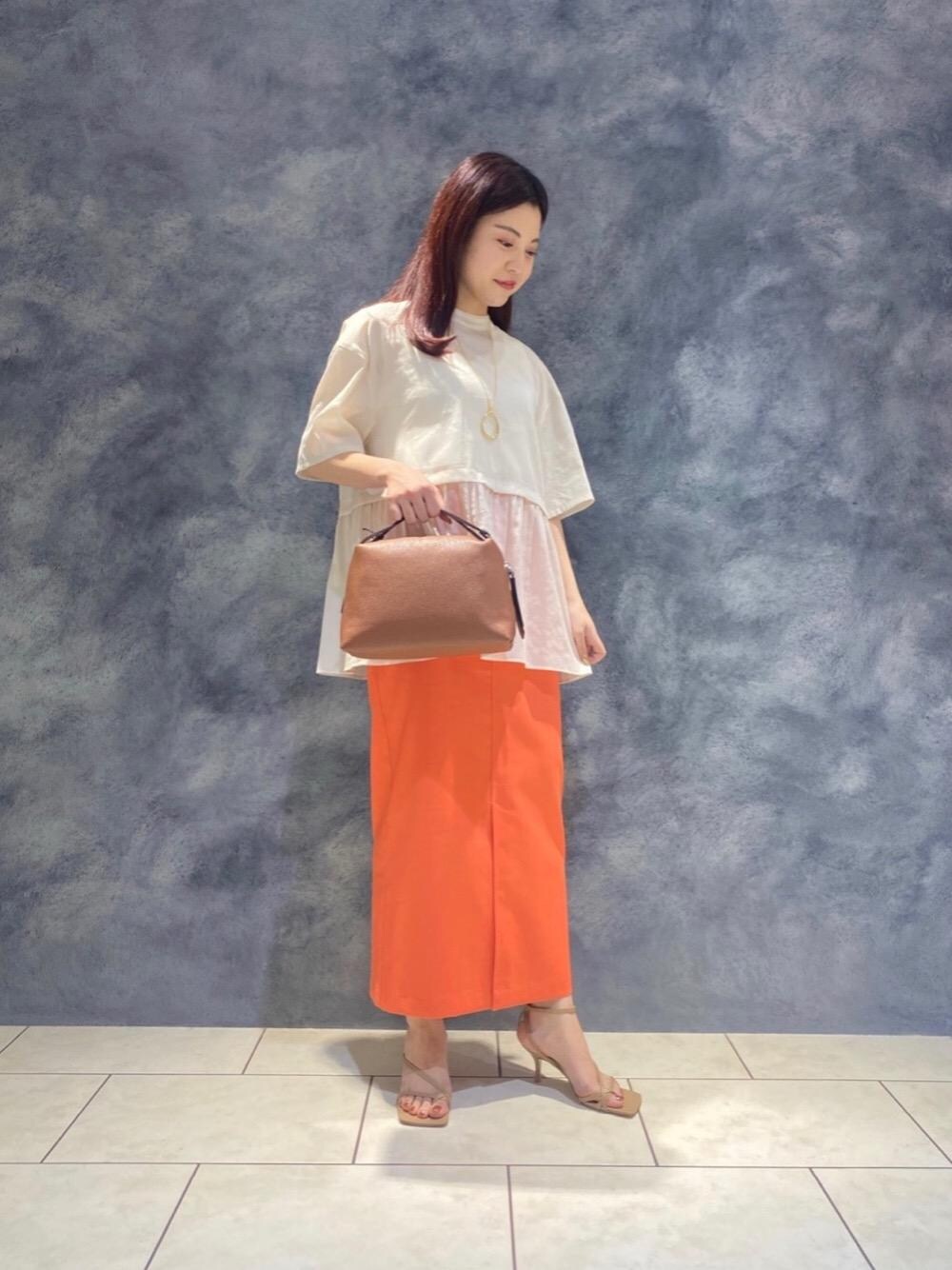 ウエストでの切り替えが特徴的なペプラムのトップスに、春らしい色鮮やかなオレンジのタイトスカートで女性らしいシルエットになるようスタイリングにしました。