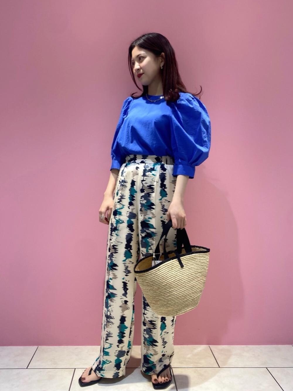 プリントが印象的なイージーパンツをポイントに、爽やかなコバルトブルーのブラウスを合わました。ボリューム袖が特徴的なトップスと春らしいバッグでフェミニンさをプラスし、女性らしいスタイリングにしました。