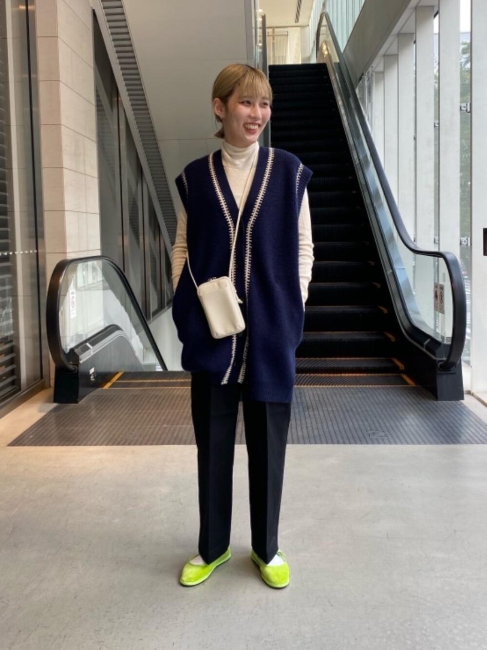 [普段サイズ] トップス: M ボトムス : M シューズ : 24-24.5cm [サイズ感] インナー:ぴったりめ ベスト: 着丈長め ボトムス:標準 シューズ : 標準 [素材感・着心地] ベスト:生地がしっかりとしたウール素材です。おしりがすっぽりと隠れるオーバーサイズで、着丈が長めのお作りになっていますのでゆったりとお召し頂けます。 インナー :コットンシルク素材で肌触りがものすごく良いです。伸縮性もあるので着心地も抜群です。 [コーディネートポイント] 今回は今の時期にピッタリの薄手のインナーを合わせましたが、ベストがオーバーサイズでレイヤードがしやすいので、気温に応じてスウェットなど厚手のものとも合わせて頂きやすいと思います。
