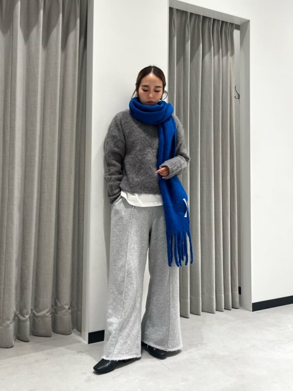 ボリュームのあるシャギーニットですが、コンパクトめな着丈なのでどんなボトムスとも相性よく合わせていただけます◎ グレーのワントーンコーデにマフラーを差し色にしました。 トップス:腰上あたりの着丈