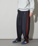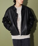 モードな印象のレザージャケットはラインパンツを合わせてキメすぎないスタイリングにしました。 ジャケット:ややゆったりめ ボトムス:ウエストは紐で絞って1回折り返しています