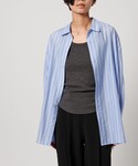 こなれ感のあるピンクのTシャツはグレーのパンツと合わせて柔らかいスタイリングに。 ぼやっとしないようシャツをアクセントにしました。 ボトムス:ゆったりめ、かかとにかかる丈感