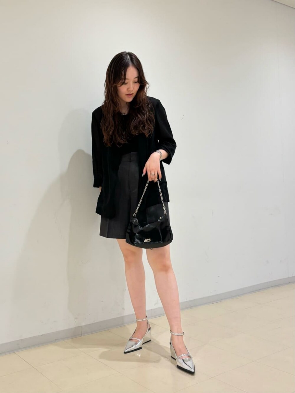 【サイズ感・履き心地】 シューズ:ポインテッドトゥで横幅がきつめに感じたので、ハーフサイズ上げて履いてちょうど良かったです。ヒールの高さは6.5cmありますが、ウェッジソールで安定感もあり、足首のベルトがしっかりとホールドしてくれるので、安心の履き心地です。 【使用感】 バッグ:財布、スマホ、小さめのポーチが入る大きさで、軽いです。フロントにコードストッパーがあり、荷物が少ないときはクシュっとさせて、フォルムの変化も楽しめます。 【コーディネートポイント】 足首のベルトが見えるように、ハーフパンツと合わせました。洋服はブラック系でまとめて、足元のギラっとしたシルバー色が映えるようにして、モード感も意識しました。