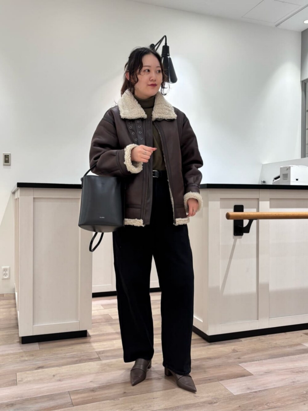 【サイズ感・履き心地】 シューズ:横幅が広めな私は、トゥ先の方が窮屈に感じたため、いつものサイズからハーフサイズ上げた24cmを履いてぴったりでした。ヒールは4.5cmので太いブロックヒールのため、安定感があって歩きやすいです。 【使用感】 バッグ:お出かけに必要なアイテムがすっぽり入ります。600mLのペットボトルも入りました。ショルダーも付いていて、2wayで使えるワンハンドルバッグです。 【コーディネートポイント】 冬はコートを着て上半身にボリューム感がでるので、足元はポインテッドトゥのヒールのあるパンプスを合わせて重たくなりすぎず、足元で抜け感を出せるようにしました。パンプスと同系色の靴下やタイツ合わせも可愛いと思います。
