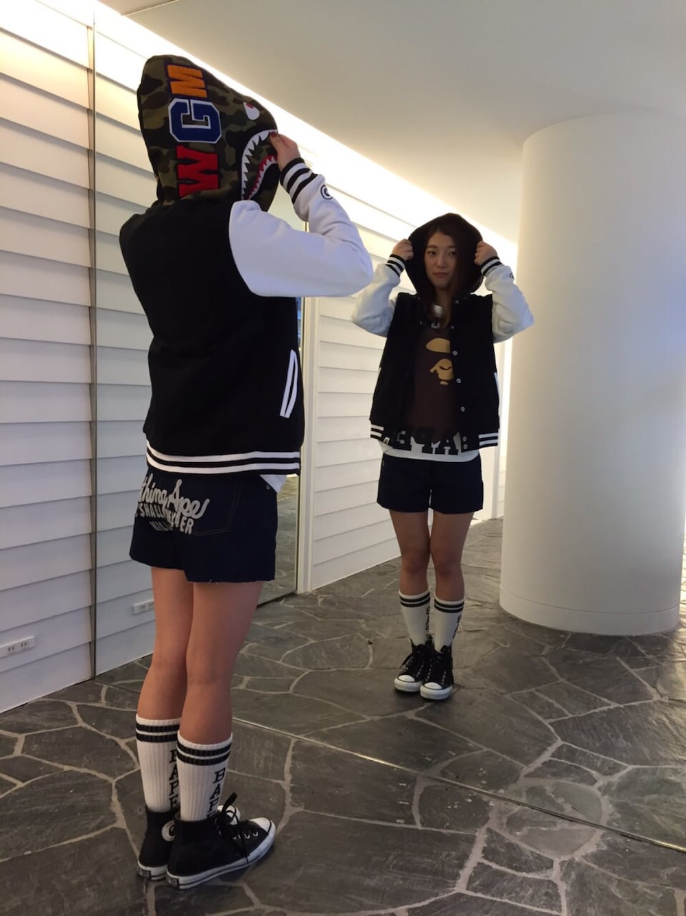 1stcamoのシャークジャケットにチャンピオンロゴのデニムショーツを合わせてbapeらしいコーディネートを組んでみました。