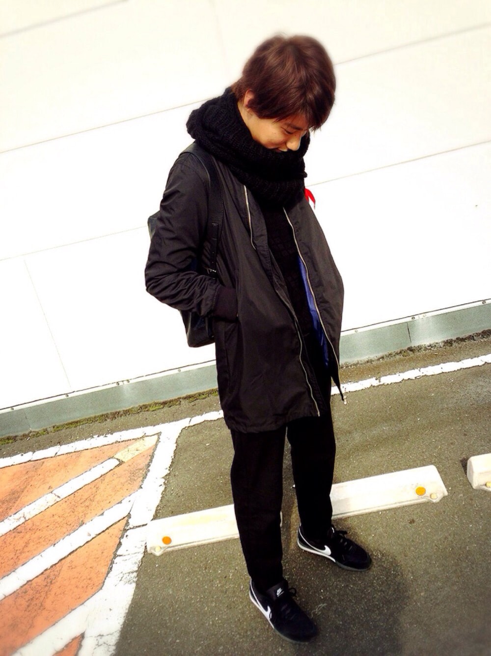 こんにちわ! 最近、靴下のサイズが無くて困っている $hu-m@です!※28センチ 今日はオールブラックで更新です! 僕の先輩に オールブラックならインナーとアウターで色の質に違いを出して色に立体感を出すとオシャレ! と、アドバイスを頂いたので 中はニットで 外はMA-1です! 人と被りたく無かったので ロングにしちゃいました笑 チェスターコートみたいになってますね それで、髪色で抜け感を 出してみました!初めてです笑 ってか、WEGOのスヌードって 長くないですか?笑 全然関係ないですね はい、さよーならー いいね、フォロー、saveお願いします
