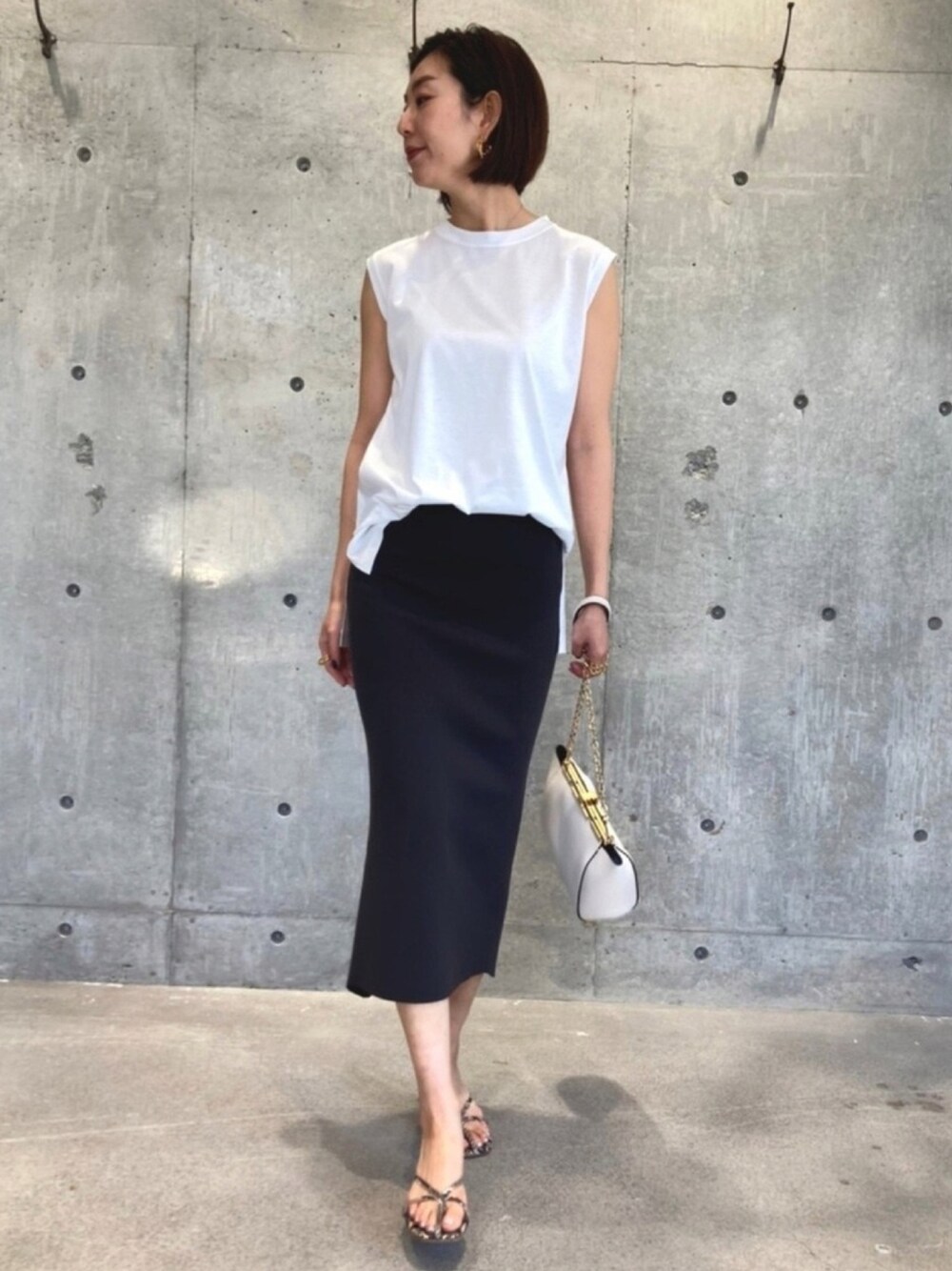 夏のシンプルスタイリングです! トップスはボックスシルエットで体のラインが出過ぎず◎ ニットスカートは黒を合わせているので、縦のラインが強調されスッキリと見えます。
