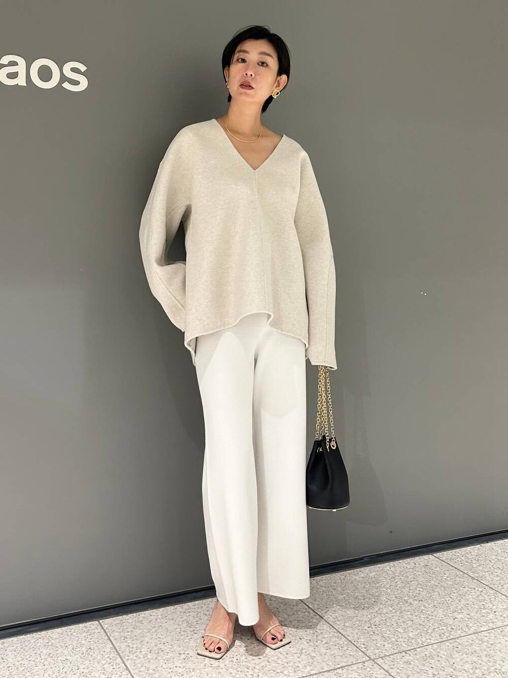 ブルーフォックスプルオーバーの自然な色味を活かした ホワイトトーンスタイリングです♪ 構築的なフォルムの布帛に近い、 張りのあるリバー仕立てのリバーニットとボトムもニットでリラックス感がありながら秋のおしゃれを楽しめるスタイリングです◎ ・ブルーフォックスプルオーバー 無染色のブルーフォックスの毛の色を活かした、リバー仕立ての圧縮ニット。 まるで織り地で出来ているような張り感があります。 体のラインを拾わない丸みを帯びたフォルムで、 袖のカーブと後ろ見頃のスリットが特徴的です。 ネックラインはスッキリとしたVネックなので、 細いところがきれいに見えて、気になるところはカバーしてくれるようなデザインです◎ ・シルクコンストレートニットパンツ 大人気のシルクコンシリーズから新型のストレートラインのニットパンツです。 肌触りがとても良く、スッキリとしたきれいなストレートラインが特徴。しっかりとしたニットで肉感を拾いづらく、スリーシーズンご着用いただけます! instagramからもおすすめアイテムご紹介しております♪ ↓↓↓