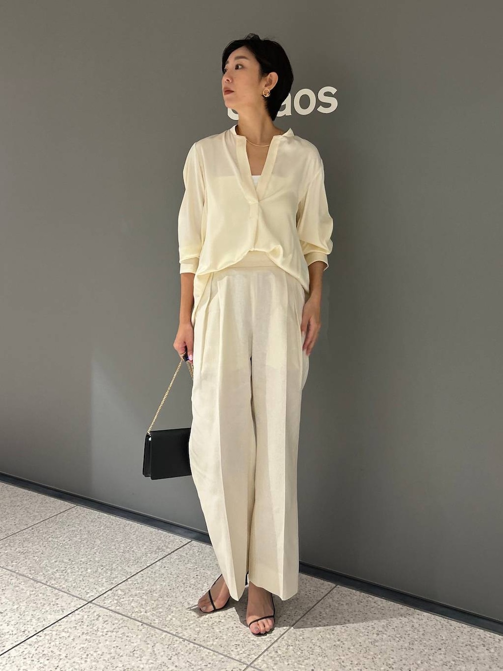 洗えるシルクシリーズから 新作のモーラスタンドスキッパーブラウスが入荷しております♪ 上品なシルクの艶がとても綺麗なブラウスです✨ 見た目以上に涼しく、肌触りも◎ 洗えるので、夏から秋にかけてロングシーズン使えます! 今回はボトムに新作のファームノームトラウザーを合わせて質感を変えたホワイトワントーンスタイリングに。 バッグやシューズの黒で引き締めています。