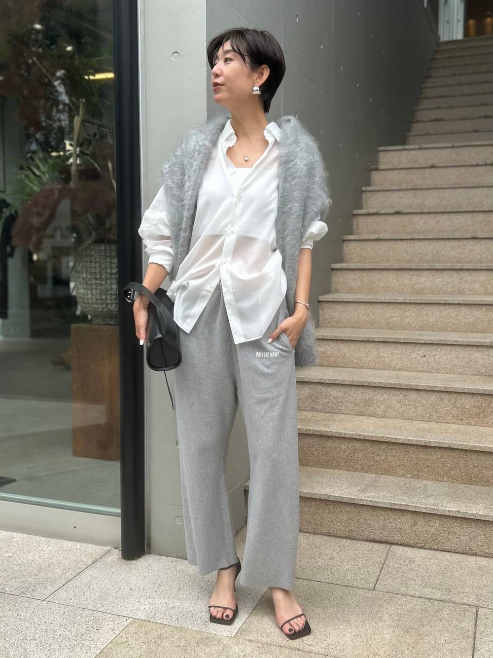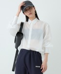 大人のカジュアルスウェットスタイリング! スウェットは大人が着こなす為には綺麗めアイテムを多めに組み込むと落ち着きます✨ トップスにシアーなシャツと足元にはヒールサンダルを合わせる事でカジュアル過ぎず馴染みます。