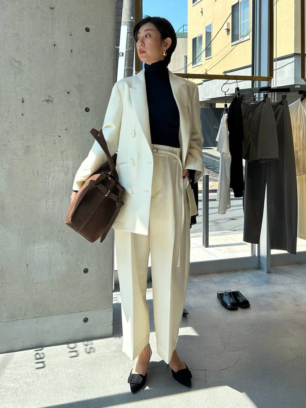 2025 FALL&WINTER COLLECTION シルクの光沢と張りが美しいガランセットアップ。 ジャケットもパンツも立体的なシルエットで体のラインを拾わずに綺麗に見せてくれます◎ 着心地はウールが90%なので見た目よりもしなやかです。 ウールシルクの上品で華やかな生地はこれからのシーズンにぴったりです✨