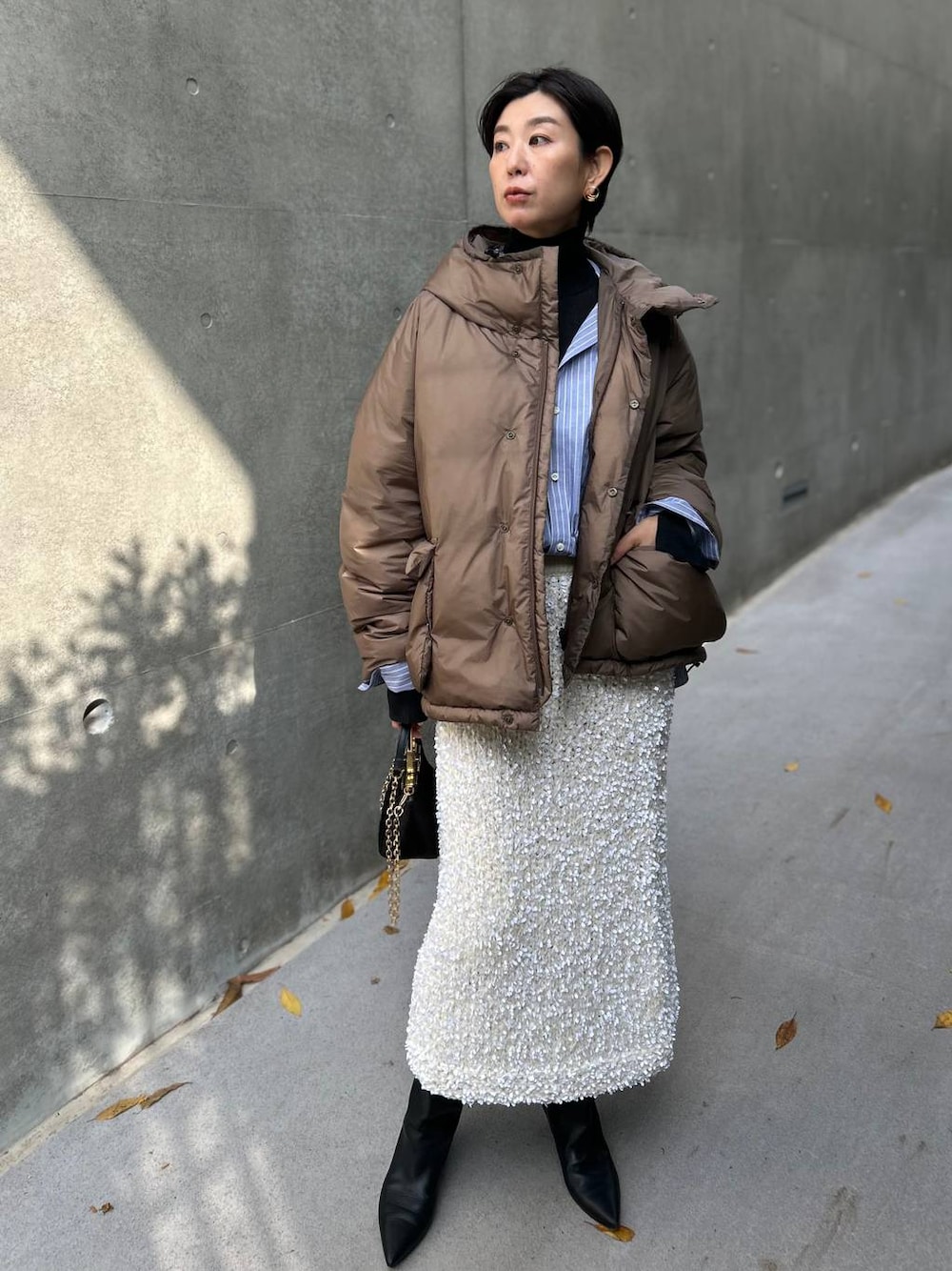 25WInter Collection Holiday mood...⭐︎。.. . これからの季節にぴったり! スパールニットスカートが入荷しました! 一点投入するだけで、とても華やかなアイテムなので、 ストライプシャツとアウターはダウンで デイリーユースに◎ 楕円のスパンコール、パールが編み込まれたニットスカートはざっくりとした編み地がなんと手編みです🧶 手編みならではの裾の編み地が変わっているところも スパンコールの見え方が変わってとても綺麗です♪ ペチコートが別で付いているので、 歩いているときは気になりませんが、 座るとやはりスパンコールとパールが肌に当たると思います。ご注意ください🙇♀️ instagramからもおすすめアイテムをご紹介しております♪ フォローしてくださると励みになります😊 ↓