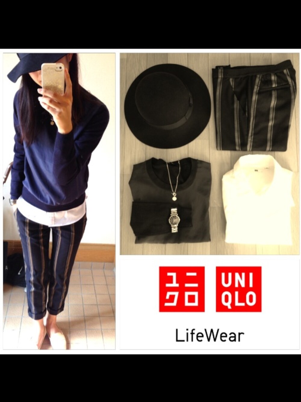 全てUNIQLOの商品です♩ UNIQLOの14AWでコーデしました(*^^*) ハット:ツバヒロハット トップス:メリノブレンドコンビセーター 異素材の切り替えになってます。 トップス:ストレッチブロードシャツ 仕事のときにも使えるシャツです。 パンツ:アンクルパンツ 今年の新柄です。 他にもチェックや無地もあります。 今回は全身ネイビーでまとめてみました!