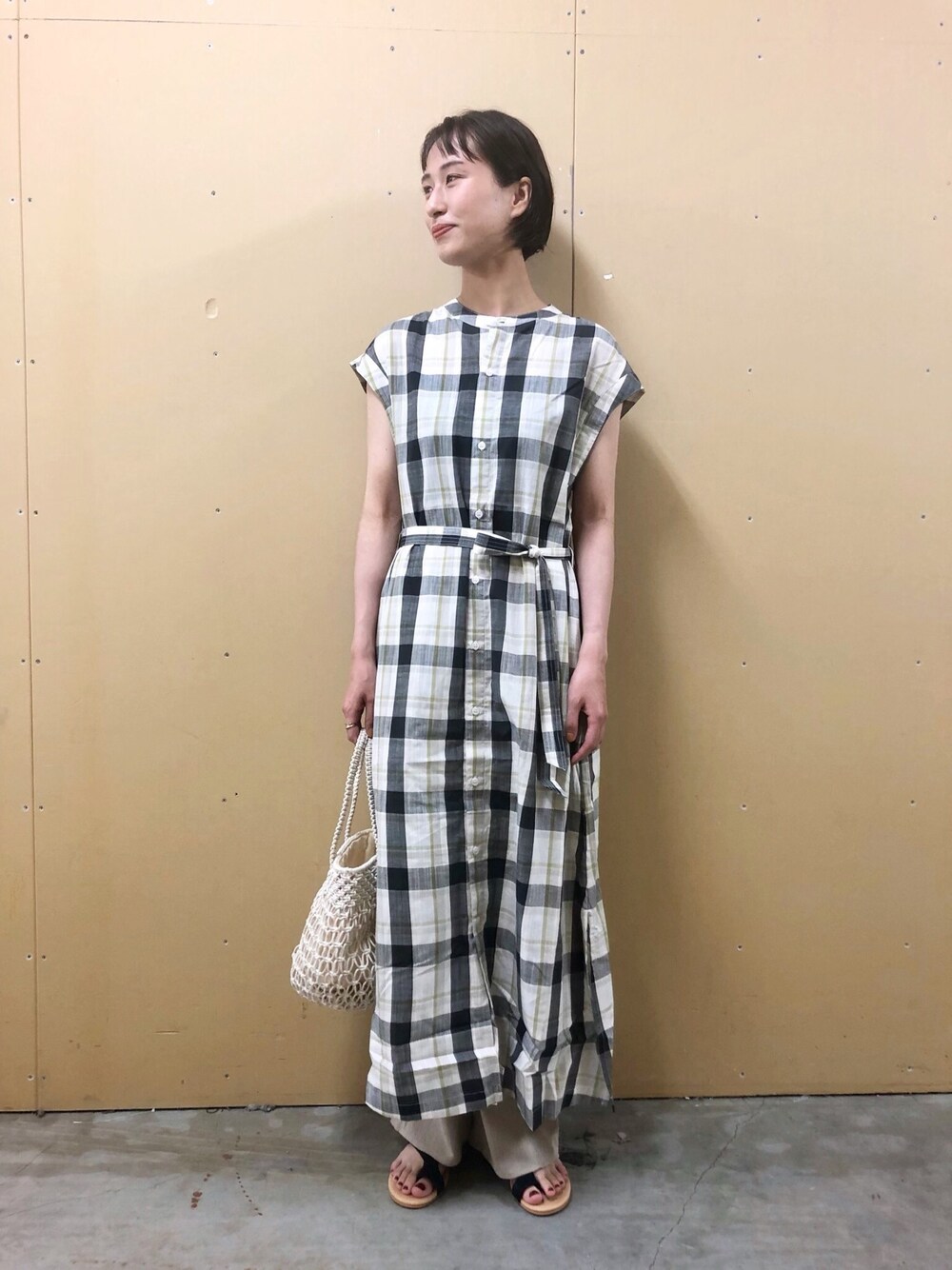 fujiのワンピース「綿麻マドラスチェック前開きワンピース」を使ったコーディネート