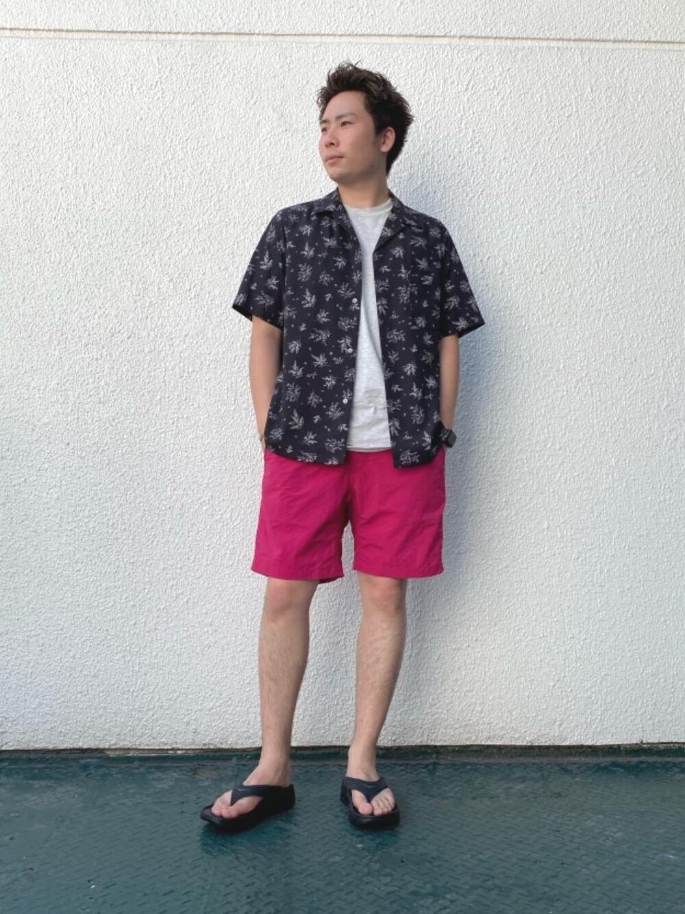 グラミチのショーツのピンクは比較的派手色ではありますが、トップスに落ち着いた色味を持ってくると使いやすい一着です。上半身は少し大き目がオススメです。