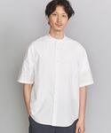 白のバンドカラーシャツはオーバーサイズでボタンを閉めてもいただいても、開けて羽織っていただいても見え方の変わるシャツです。 ショーツに合わせて大人のリゾート感を意識してスタイリングを組みました。