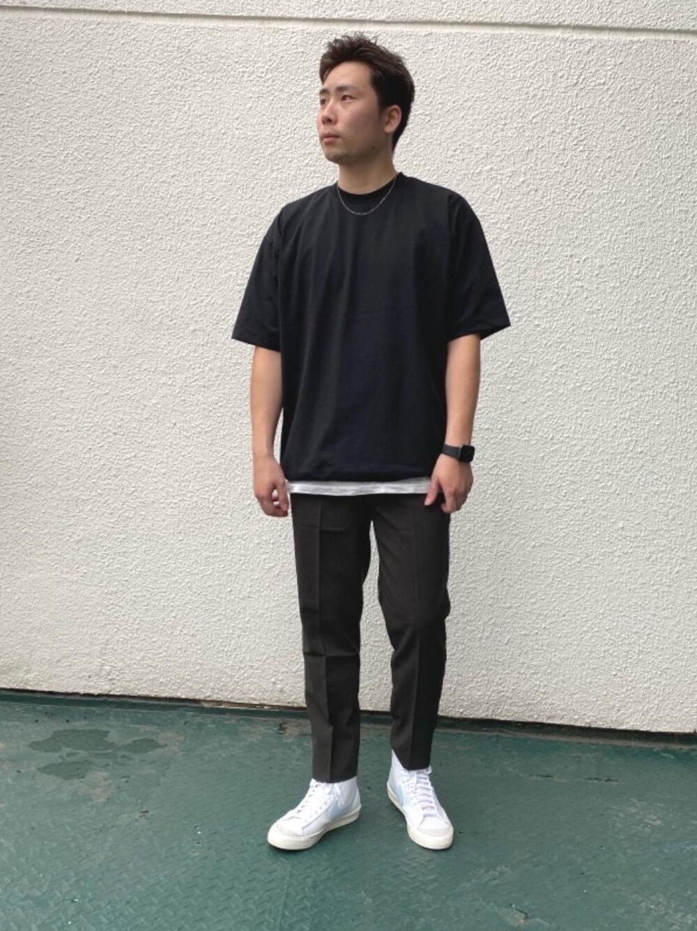 黒のトップスは、ドローコードが付いており、少しゆったりなシルエットから締まったシルエットに気分で変えることができます。ポリエステル素材でスポーティーな印象ですが、スラックスと合わせていただけるとまとまりが出ます。