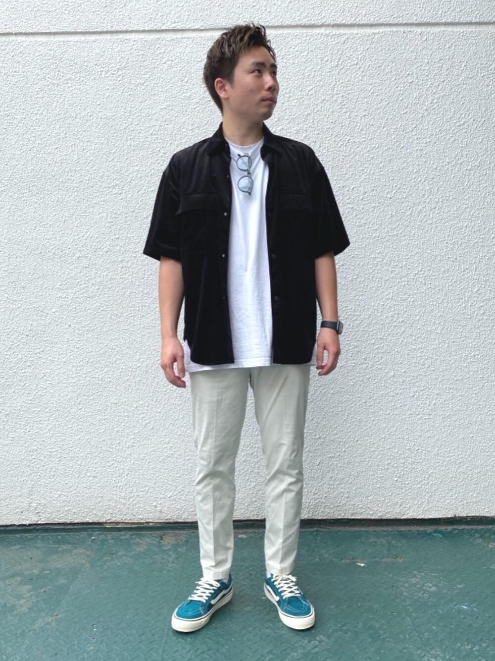 〈monkey time〉のコーデュロイシャツ。少しコーデュロイは重たいイメージですが、今の時期細身のパンツと合わせていただくと、大人カジュアルな雰囲気で使っていただけます。全体的にモノトーンなのでシューズに〈vans〉のカラースニーカーを合わせました。