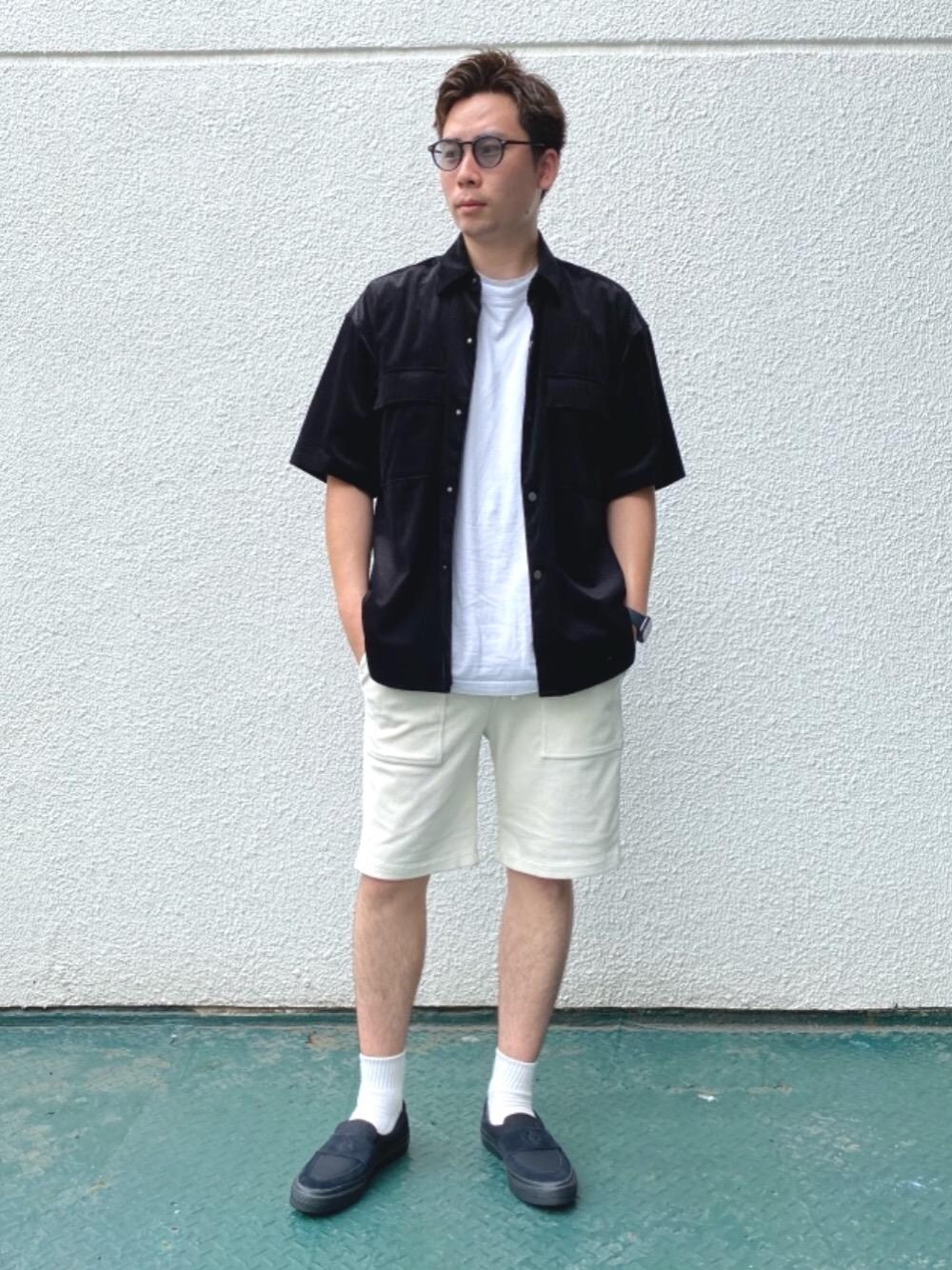 〈monkey time〉のコーデュロイシャツは少しシルエットが大きめなので、細身なショーツとの相性が◎。夏らしい大人のリゾート感を意識してスタイリングを組みました。