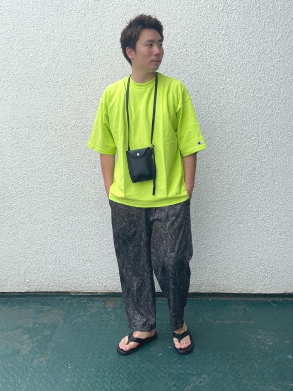 〈CHAMPION×MT〉のトップスはオーバーサイズでゆったり来ていただくと雰囲気がいいです。 パンツは細いものより少しルーズなシルエットを選んでいただくとトップスの雰囲気とも相性◎ トップスの色味が強いのでバック等小物で色を締めてみました。